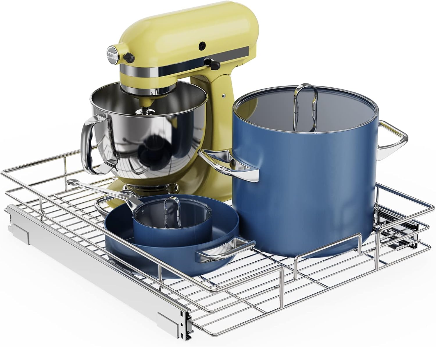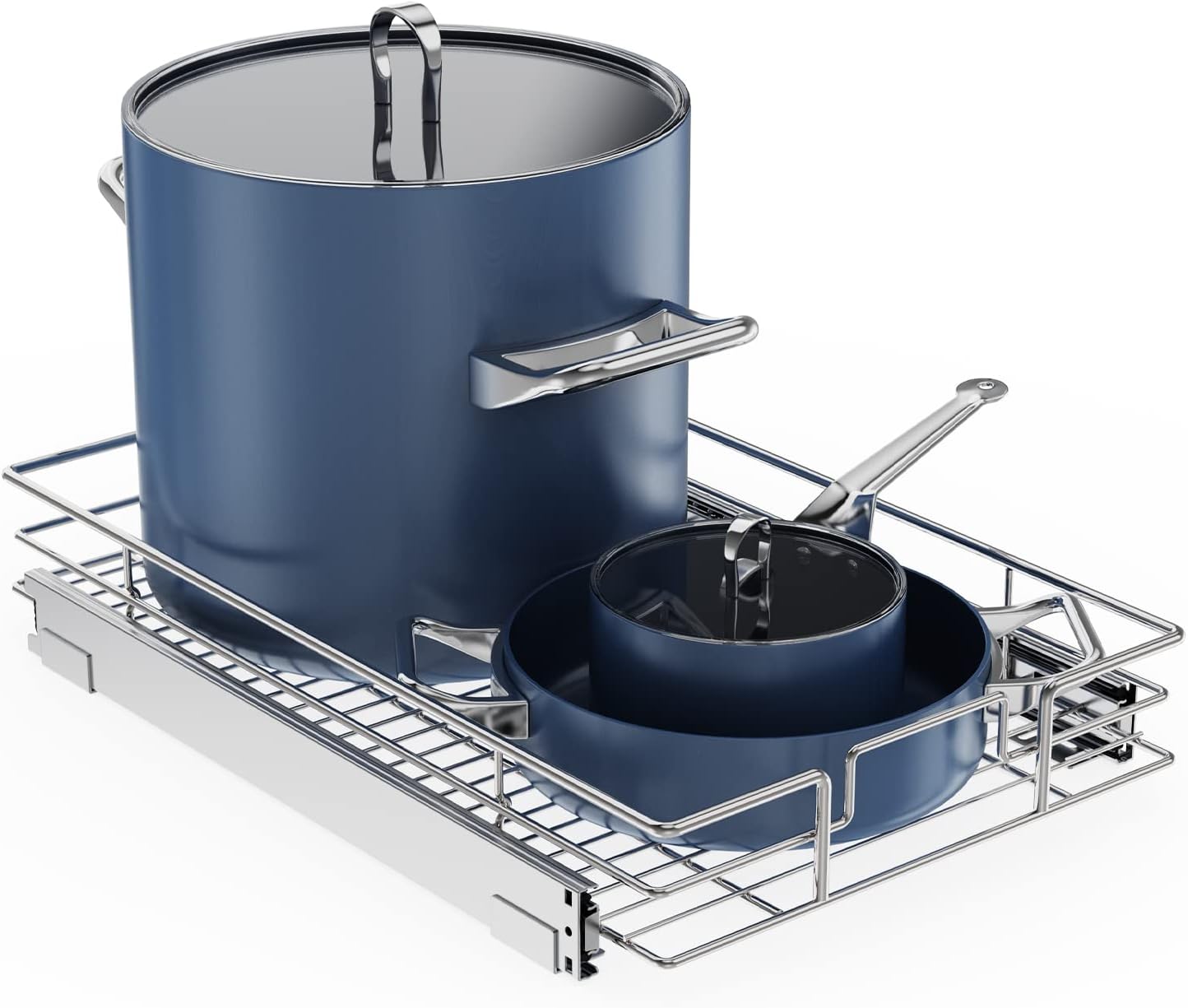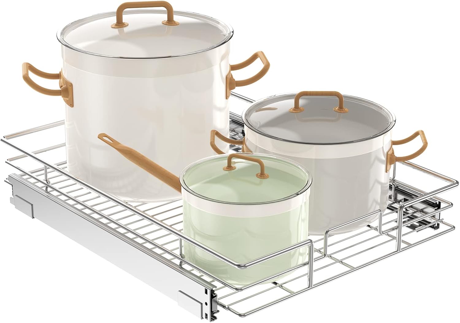 Stop sorting through a jumbled mess of pots and pans just to find what you need. Take control of your cabinet space and eliminate the chaos of your pot and pan storage with this pot and pan lid organizer. This cabinet organizer allows you to command the full space of your cabinets while keeping your pots, pans and lids organized and easy to reach. No more bending down or kneeling to reach into the cluttered corners of your cabinets.