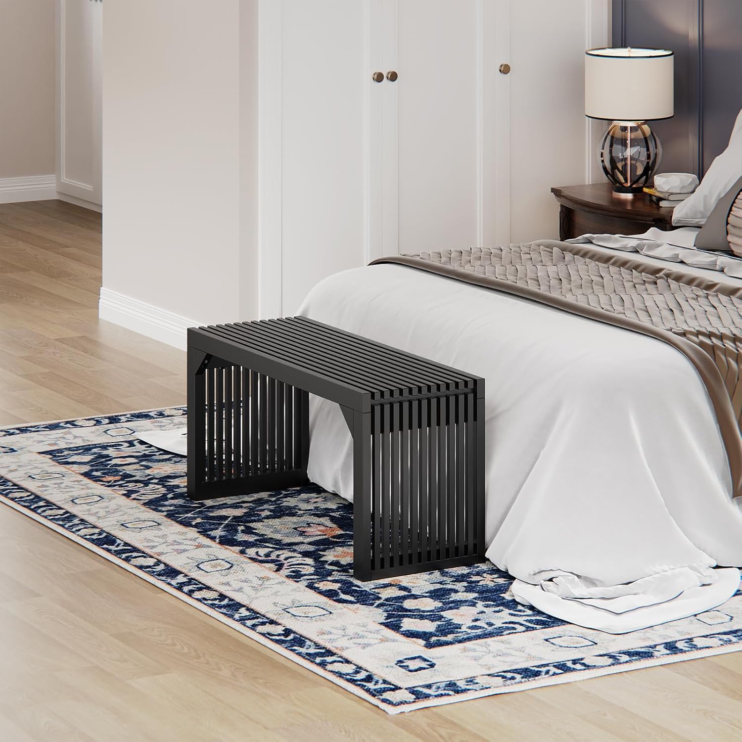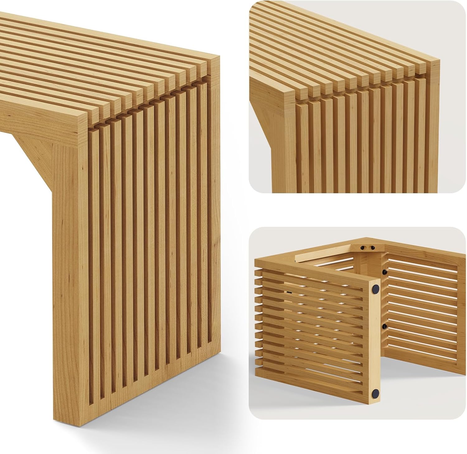 ROOMTEC versatile wooden bench that can be used as entryway bench, shoe bench, sofatable, shower bench, bedroom bench, dining bench, garden bench, patio bench, outdoor bench. A grille style wooden bench, sleek lines, distinctive look and rustic style. It is a perfect piece for your home.