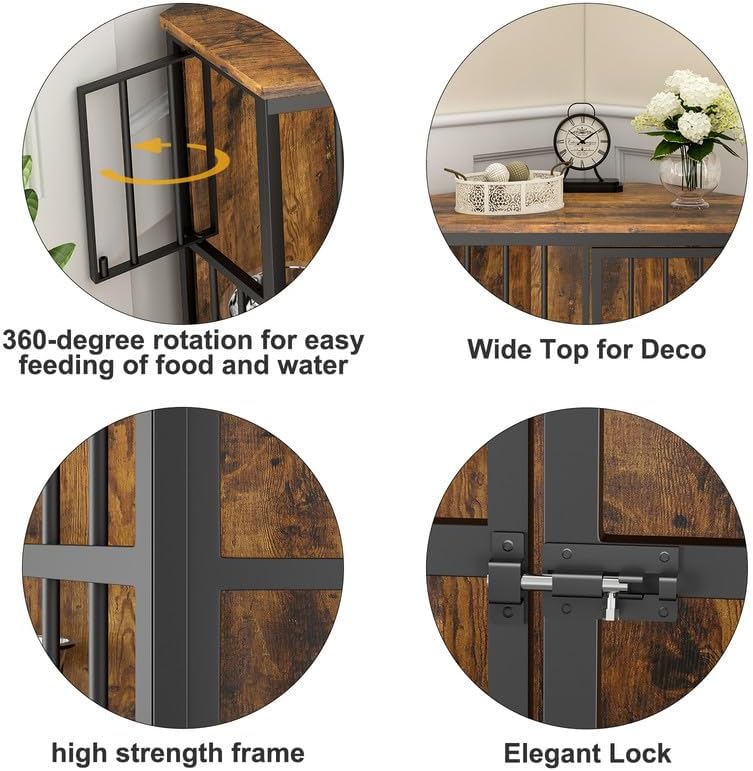 ROOMTEC 42 inch Furniture Dog Crate Corner, Dog Kennel Corner Wooden End Table with Bowl, Indoor Pet Crates Corner Side Table for Dogs, Wide Top Perfect for Limited Room