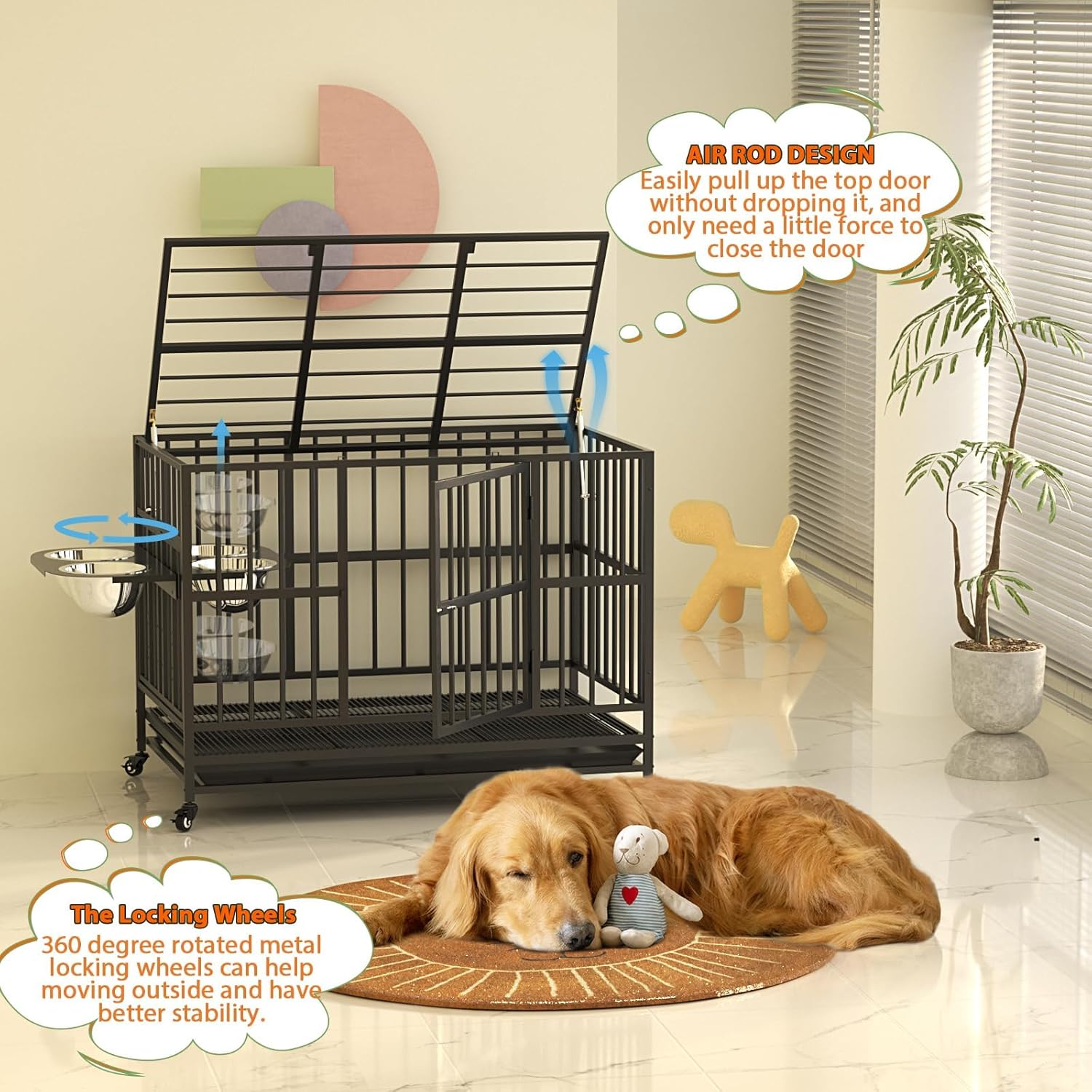 ROOMTEC 43" Heavy Duty Dog Crate with Unique Air Lift Rod/Wheels/ 360° & Adjustable 2 Bowls, Extra Medium Dog Crate