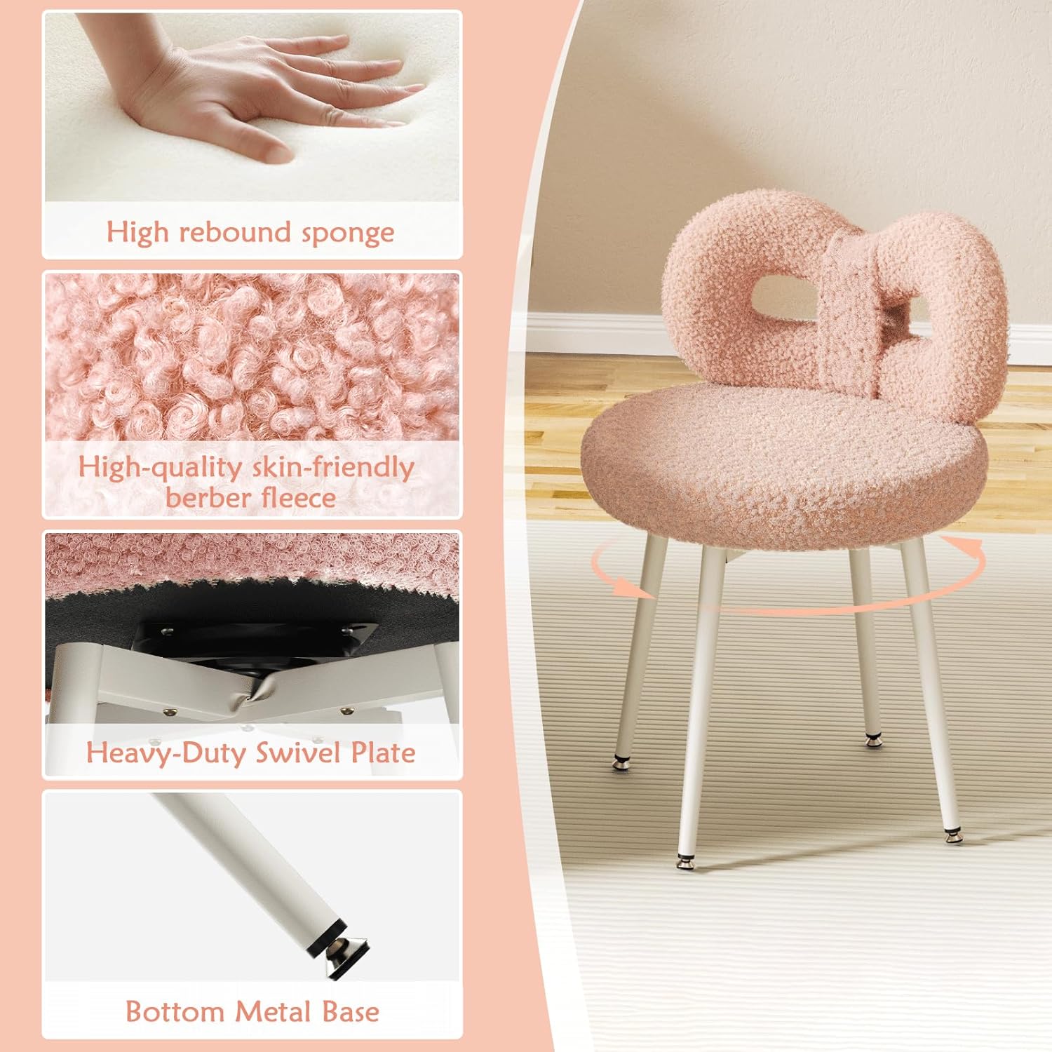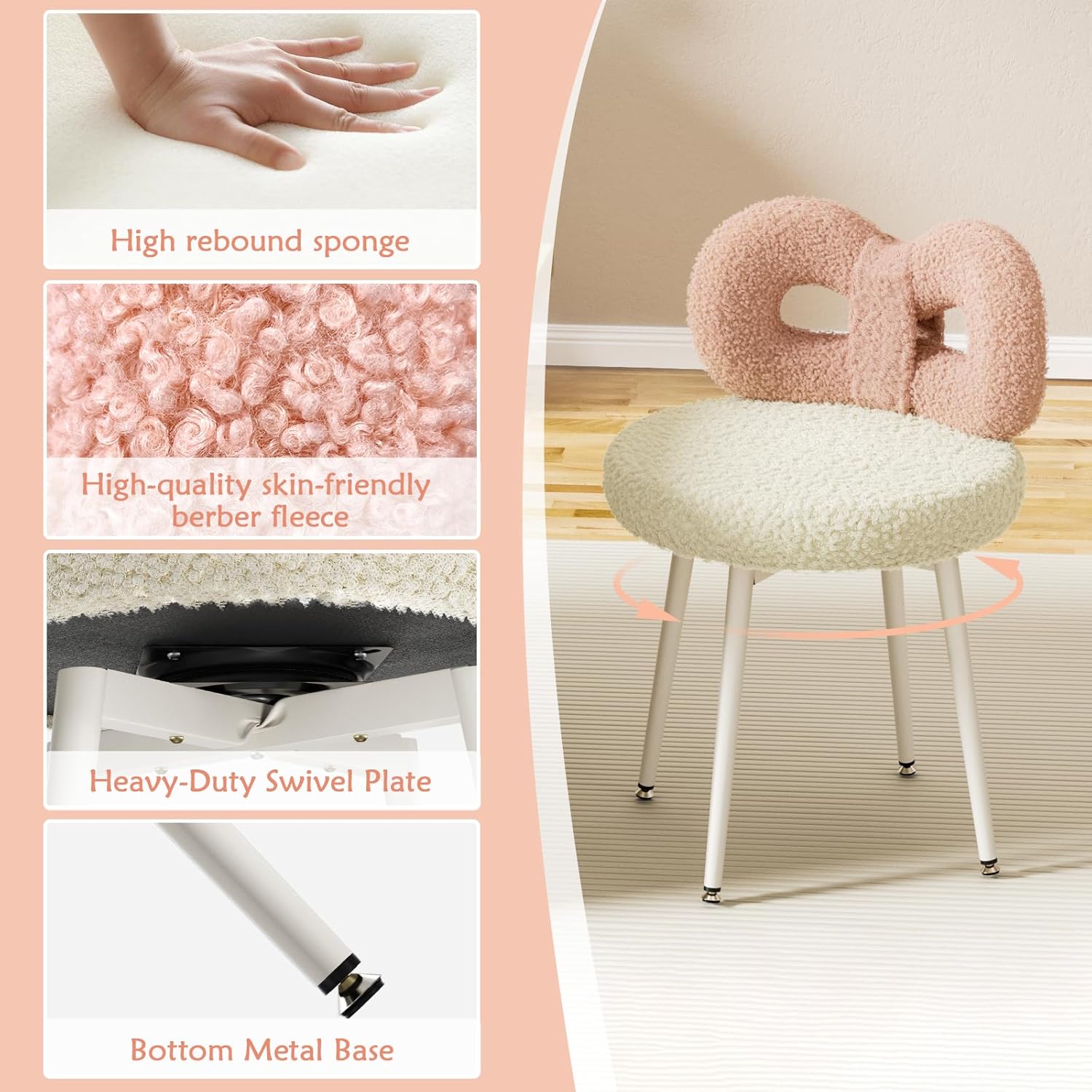 ROOMTEC Bedroom Pink Chair | No Wheels, Small Swivel, Upholstered, Cute Bow Backrest | Living Room, Comfy Desk, Makeup Reading Dining | Girls, Women, Kids