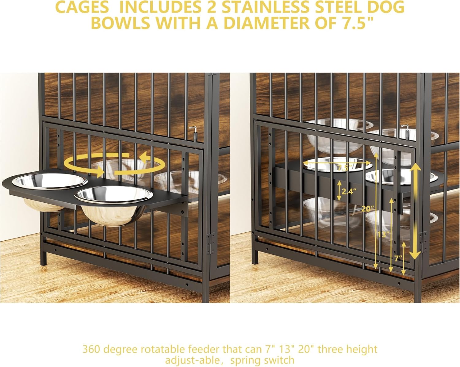 ROOMTEC Furniture Style Large Dog Crate with 360° & Adjustable Raised Feeder for Dogs 2 Stainless Steel Bowls -End Table House Pad, Indoor Use,41" L X 24" W 36" H, Classic Brown