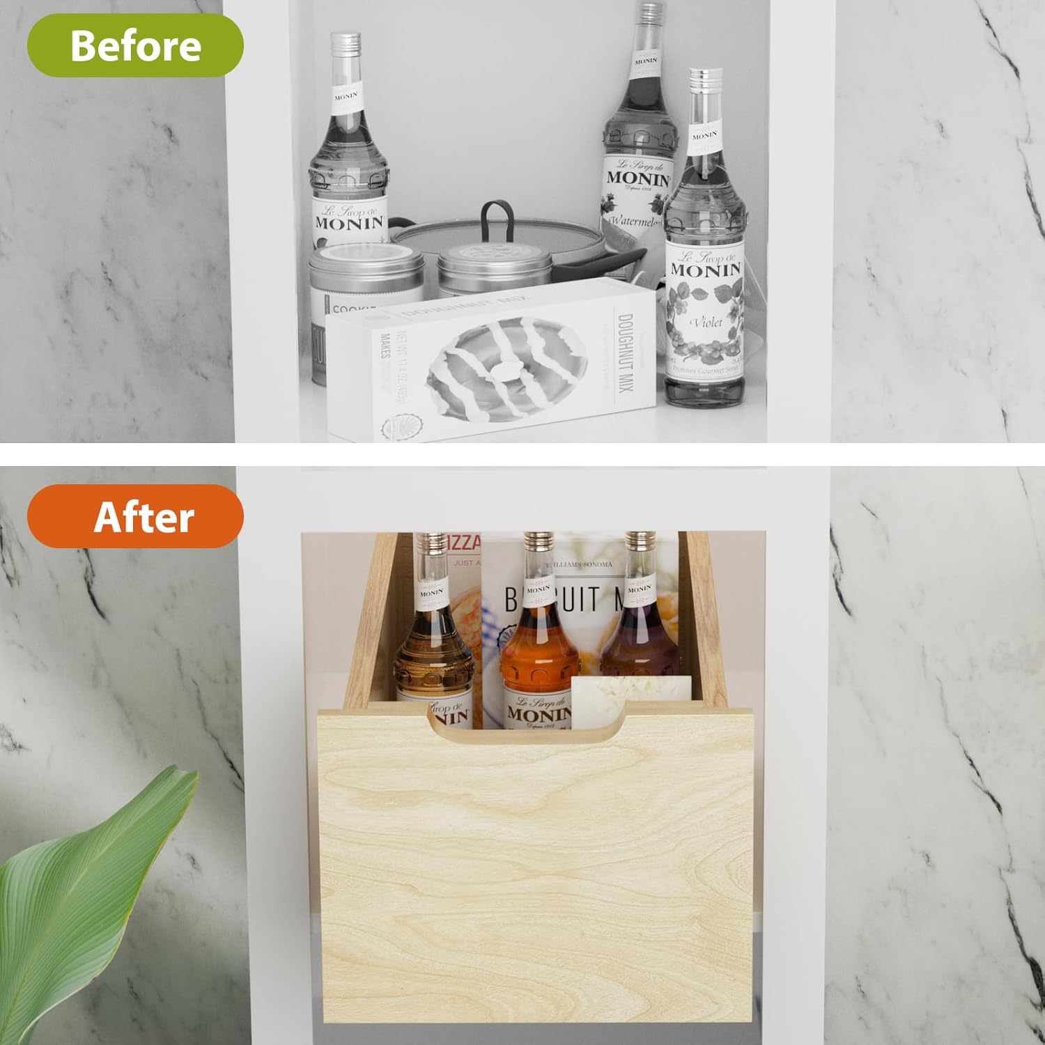This 8-inch tall pull out drawers with doubled side and back heights, forming a wrap-around shield to prevent taller items from toppling off your shelves.