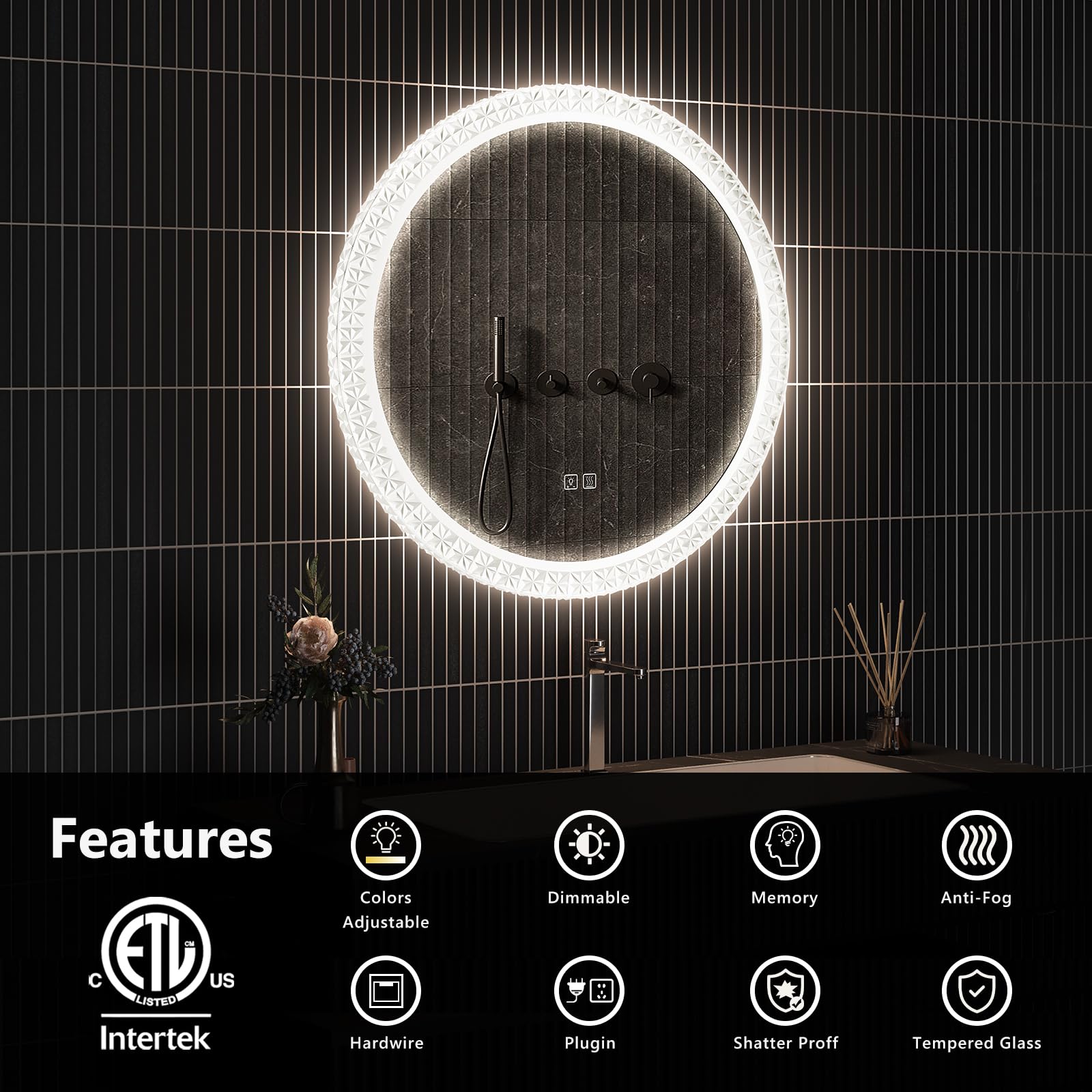 - ¡¾ETL Certification & High Quality Materials¡¿ This product is ETL certified, conforming to U.S. producing safety standard. This bathroom LED vanity round mirror adopts environmental friendly, copper free HQ silver coating glass, and IP54 waterproof LED lights to ensure 100% safety in wet bathroom.
